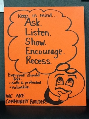 Our theme this month is “Community Building”. This was a visual for some time spent with the grade five class. It was meant to give the kids specific tools for making others feel protected and valuable, especially those kids that are new to the community.