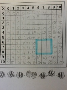 I call this “Pyramid Facts”. It was my way of making the memorization of multiplication facts more manageable and less overwhelming. First the students learn a song for counting by threes and a song for counting by fours as well as a “trick” for nines. Then the students and I fill in the “easy” facts on the multiplication grid. We know how to count by ones, twos, threes, fours, fives, nines, and tens so this goes rather quickly. What I love is that the students are always surprised by how much they know! There are only nine squares open on the grid that need to be memorized. Thanks to the commutative property of multiplication there are actually only six facts to memorize (7×8 is the same as 8×7). I call these six facts the Pyramid Facts. We spend time memorizing these and students begin to gain confidence in their ability to know the multiplication facts. (Remember that while learning these facts, students should begin by seeing the correct answer so that a correct mind picture forms. On my pyramid I put sticky notes. The students first practice by saying the facts aloud then I take the sticky notes off and they again say the facts aloud while replacing the answers.)