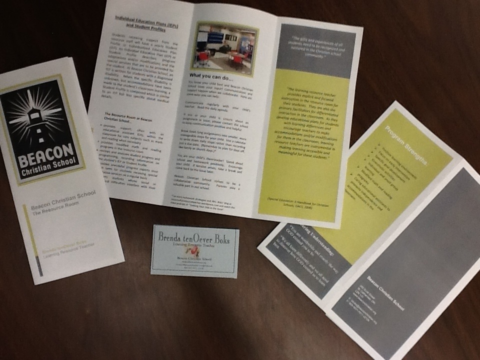 One solution to this problem is a brochure. I created a brochure about my classroom to explain my goals, what is important to me, and the type of services that the resource room offers. I used the brochure to explain some of the terms and paperwork used in the resource department.